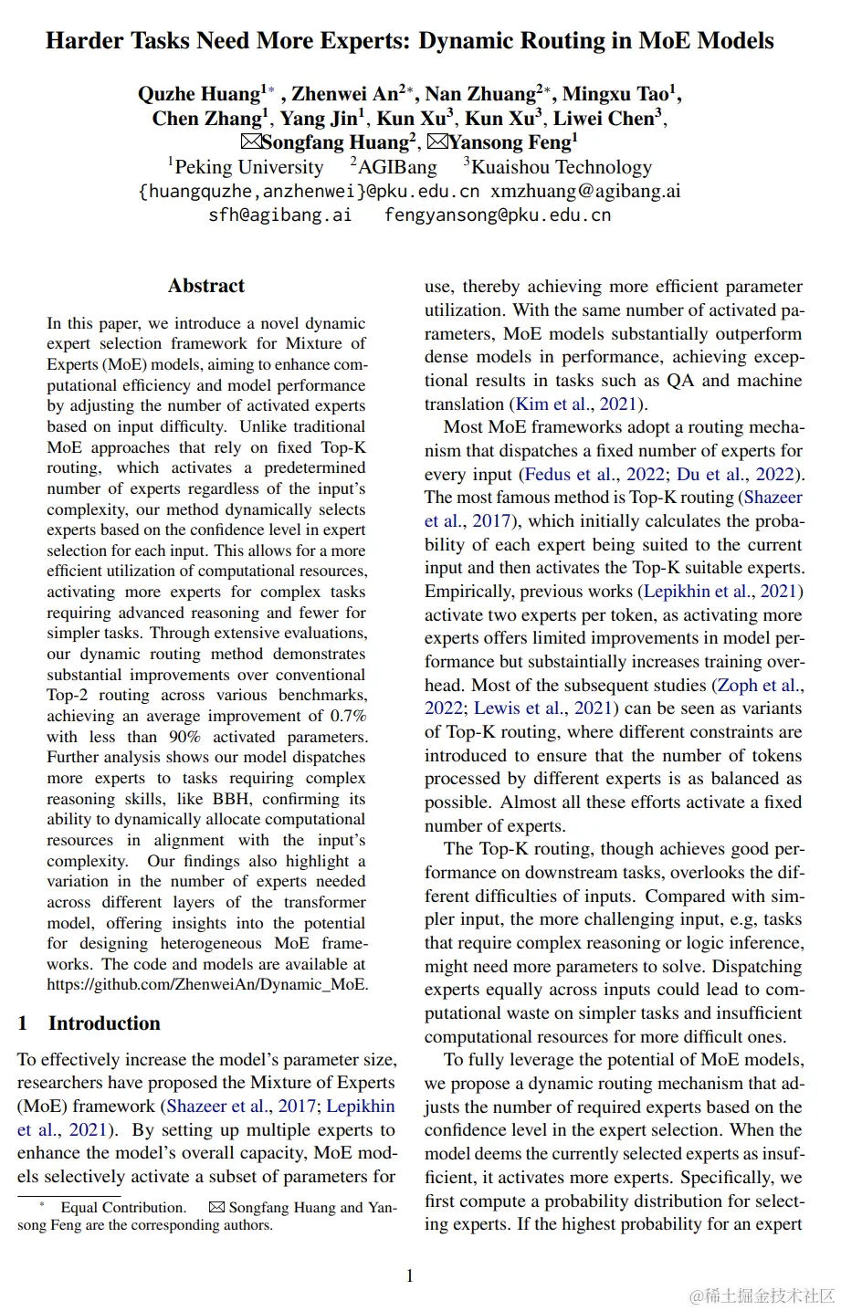 在本文中,我们介绍了一种新颖的动态专家选择框架,用于混合专家(MoE)模型,旨在通过根据输入难度调整激活专家数量,从而提高计算效率和模型性能。与传统的MoE方法不同,传统方法依赖于固定的Top-K路由,无论输入的复杂性如何都会激活预定数量的专家。我们的方法根据每个输入中对专家选择的信心水平动态选择专家。这允许更有效地利用计算资源,对于需要高级推理的复杂任务激活更多专家,而对于简单任务则激活更少。通过广泛评估,我们的动态路由方法在各种基准测试中显示出与传统Top-2路由相比的显着改进,平均提高了0.7%,激活参数少于90%。进一步分析显示,我们的模型将更多专家分配到需要复杂推理技能的任务,如BBH,验证了其动态分配计算资源以符合输入复杂性的能力。我们的发现还强调了转换器模型不同层中所需专家数量的变化,为设计异质MoE框架提供了见解。代码和模型可在github.com/ZhenweiAn/D… 中找到。