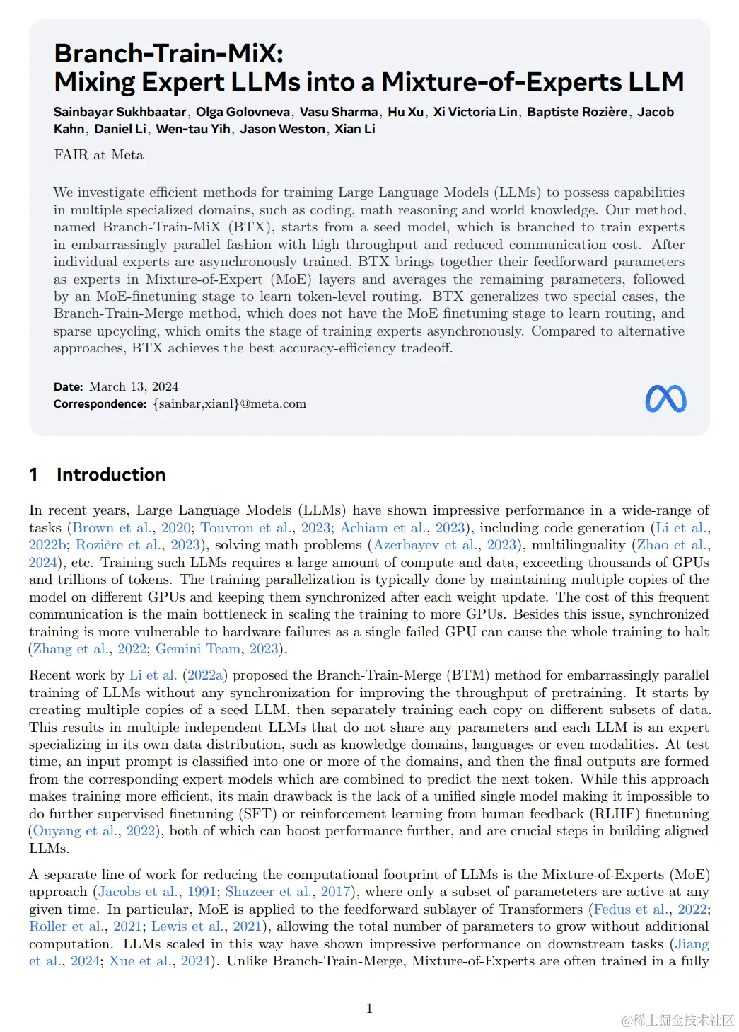 我们研究了训练大语言模型(LLMs)在多个专业领域具有能力的高效方法,例如编码、数学推理和世界知识。我们的方法名为Branch-Train-MiX(BTX),从一个种子模型开始,分支训练专家,以令人尴尬地并行、高吞吐量和降低通信成本的方式。在各个专家被异步训练后,BTX将它们的前向参数作为Mixture-of-Expert(MoE)层中的专家聚合,平均剩余参数,随后进行MoE微调阶段以学习token级别的路由。BTX泛化了两种特殊情况,分支训练合并方法不需要MoE微调阶段学习路由,稀疏回收省略了异步训练专家阶段。与其他方法相比,BTX实现了最佳的准确性和效率平衡。