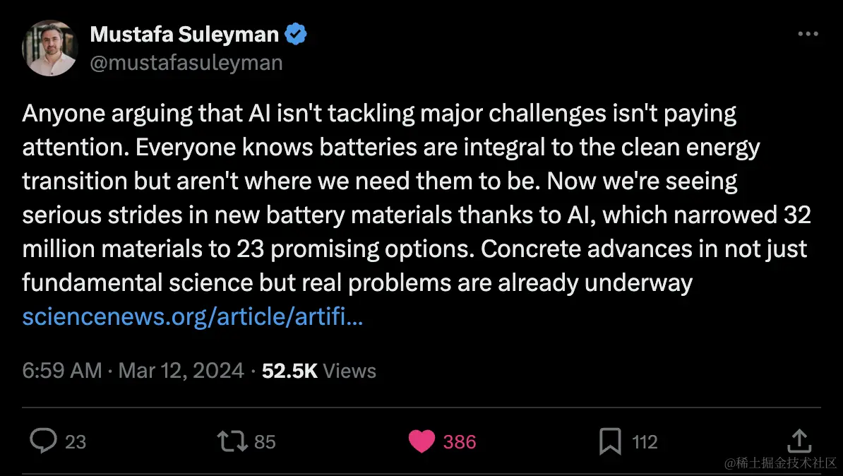 Suleyman:不要认为AI没有解决重大挑战,我们在新电池材料方面因为AI看到了重大进展