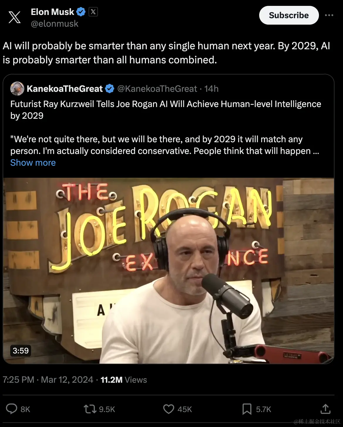 马斯克:AI可能在明年就会比任何一个人类都更聪明。到2029年,AI可能比所有人类加起来还要聪明