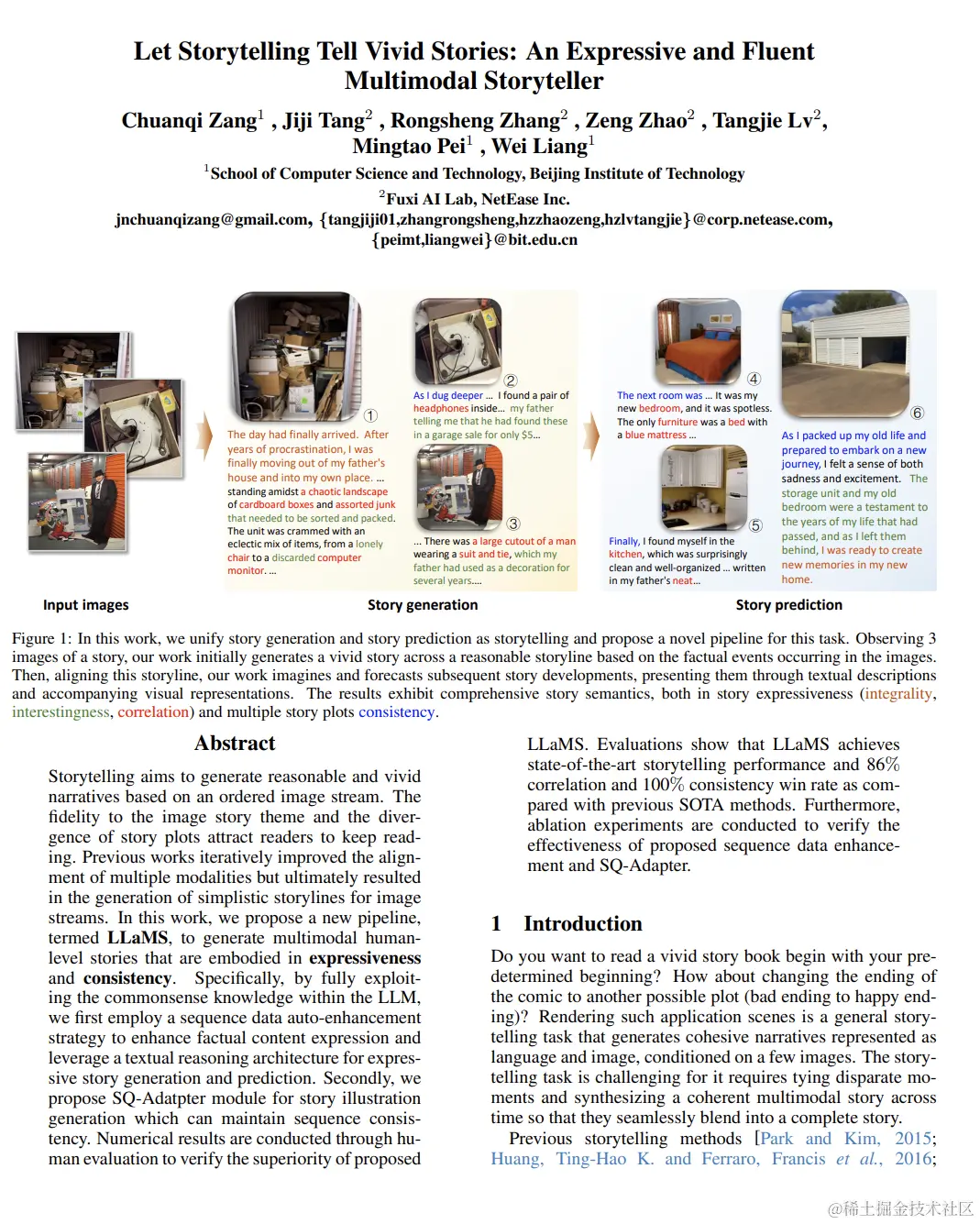 故事叙述旨在基于有序图像流生成合理和生动的叙述。对图像故事主题的忠实和故事情节的多样性吸引读者继续阅读。先前的作品通过迭代改善多模态对齐,但最终导致生成简单故事情节的图像流。在这项工作中,我们提出了一个新的流水线,称为LLaMS,以生成体现表现力和一致性的多模态人类级故事。具体来说,通过充分利用LLM内的常识知识,我们首先采用序列数据自动增强策略增强事实内容表达,并利用文本推理架构进行表现力强的故事生成和预测。其次,我们提出了用于故事插图生成的SQ-Adapter模块,可以保持序列一致性。通过人类评估进行了数字结果验证,证实了所提出的LLaMS的优越性。评估结果表明,LLaMS实现了最先进的叙事性能,并与先前的SOTA方法相比,具有86%的相关性和100%的一致性胜率。此外,进行了消融实验以验证所提出的序列数据增强和SQ-Adapter的有效性。