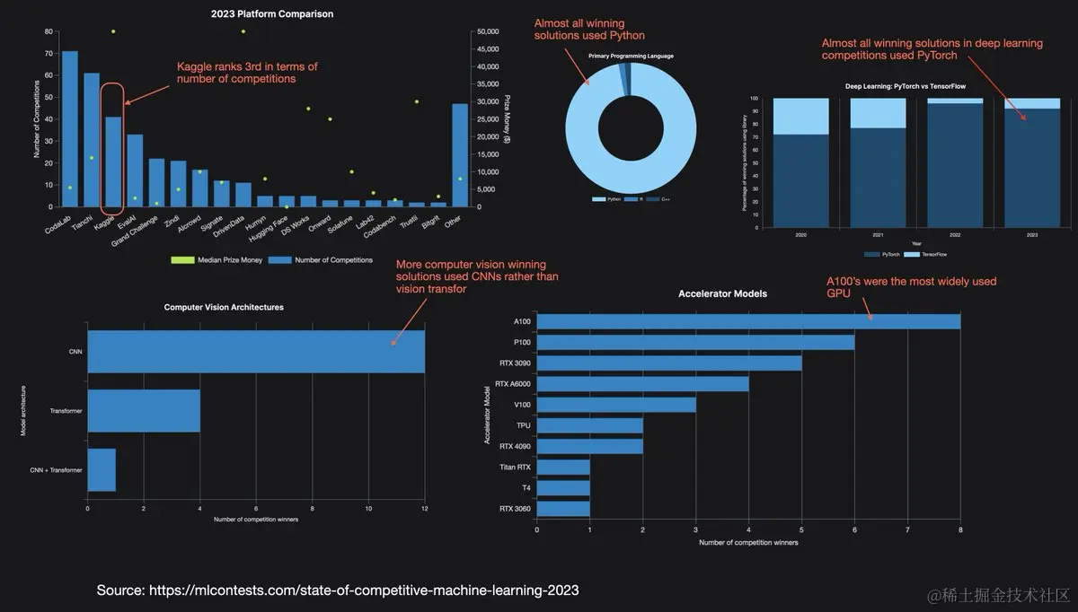 在大众认知中,我的感觉是,与2010年代中期相比,ML竞赛已不再那么受欢迎。然而,我们看到奖金大幅增加。考虑到运行基于Transformer的LLM和Vision Transformer的硬件和云计算要求,这可能是为了证明保持竞争力的更高成本是合理的。(超过70%的获胜者使用GPU训练模型。)