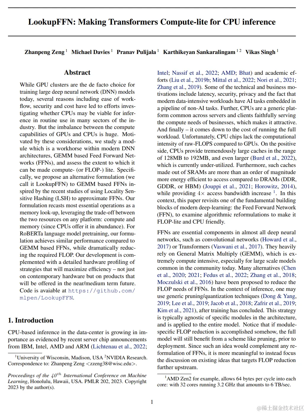 尽管GPU集群是当今训练大型深度神经网络模型的事实标准选择,但出于工作流程的简便性、安全性和成本等多种原因,人们开始研究是否CPU在许多行业领域的日常推断中可能是可行的选择。我们研究了现代DNN架构中的工作模块,基于GEMM的前馈网络(FFNs),评估其在可以进行计算(或FLOP)轻量化的程度。具体来说,我们提出了一种替代公式(我们称之为LookupFFN),受到最近的使用局部敏感哈希(LSH)来近似FFNs的研究的启发。我们的公式将大多数关键操作重构为内存查找,利用任何平台上两种资源(计算和内存)之间的权衡:计算和内存(因为CPU在这方面提供丰富)。对于RoBERTa语言模型的预训练,在减少所需FLOP的同时,我们的公式实现了与基于GEMM的FFNs类似的性能。我们的开发是与详细的硬件配置文件分析相辅相成,这将最大程度地提高效率- 不仅适用于当前硬件,而且适用于不久的未来/中期产品。可以在github.com/mlpen/Looku…