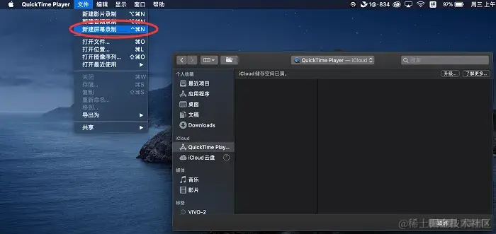 第2步:点击菜单栏中的 “文件” 选项,选择 “新建屏幕录制” 功能。在弹出的录制窗口中,你可以选择是否显示鼠标轨迹和录制麦克风声音。点击屏幕录制按钮开始录制,或使用快捷键 “Cmd + Shift + 5” 。