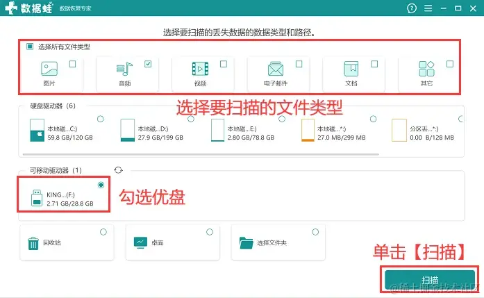 步骤2:勾选上需要扫描的文件类型,并将优盘勾选上,单击【扫描】;