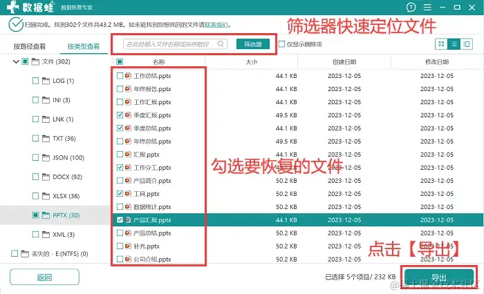 步骤3:等待软件扫描完优盘,用户可以对扫描结果进行查看,在查看时,将需要恢复的文件勾选上,点击【导出】。