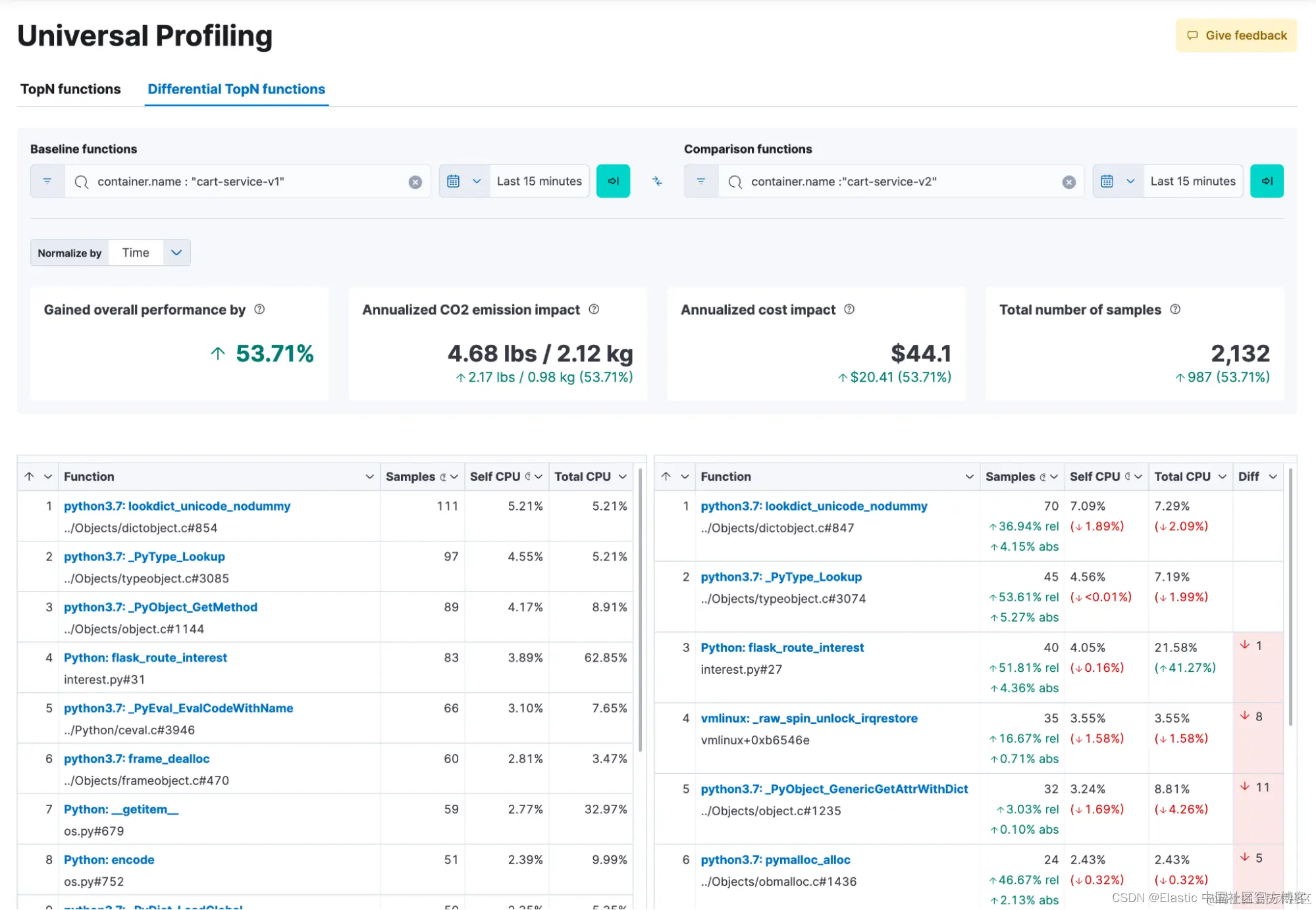 此外,采用全系统性能分析策略(例如 Elastic Universal Profiling)与仅关注运行时的传统仪器分析器有很大不同。 Elastic Universal Profiling 提供整个系统的可见性,不仅可以分析你自己的代码,还可以分析第三方库、内核操作和你不拥有的其他代码。 这种综合方法通过识别非最佳公共库并发现消耗 CPU 周期的 “未知的未知因素(unknown unknowns)” 来促进快速优化。 通常,当库或某些守护进程的资源消耗超过应用程序本身的资源消耗时,就会达到临界点。 如果没有系统范围的分析,以及按服务切片数据和聚合总使用量的功能,精确定位这些资源密集型组件将成为一项艰巨的挑战。