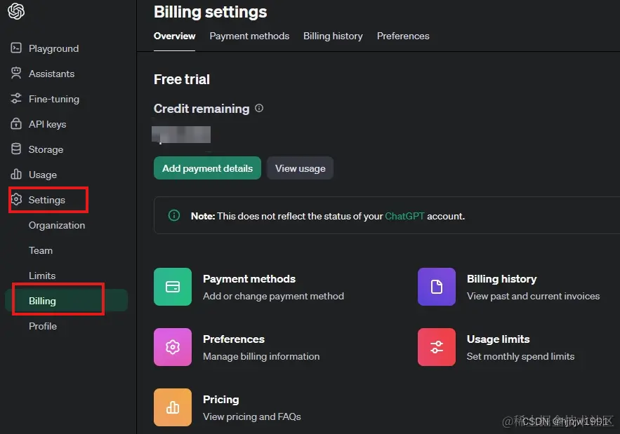 完成后,可进入 ChatGpt 界面,在左侧 Billings 看到余额。