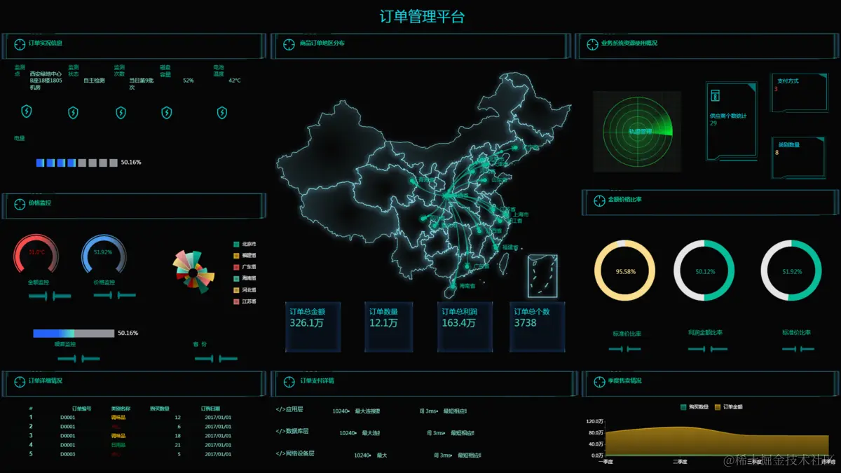 在设计之前,先确定需要展示展示哪些数据,然后根据数据的特性选择合适的图表进行展示。比如展示销售额、订单数之类的统计数据最好是富文本或者指示器;想查看分布情况就使用地图类组件等等。根据想要展示的数据选择对应的图表。