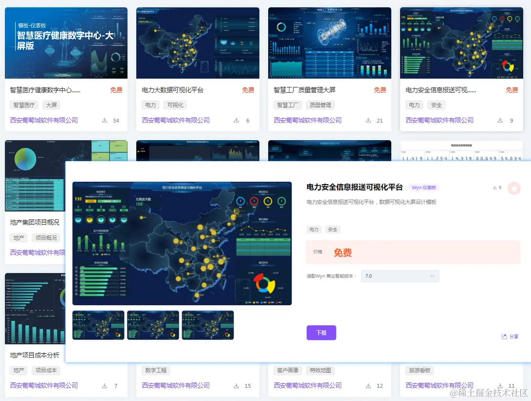 在设计时,前期的数据准备不尽相同,但是在最后的展示上常常是大同小异,这种情况下,我们就可以从葡萄城市场查找模板,然后直接通过模板创创建仪表板,然后替换使用的数据模型即可。