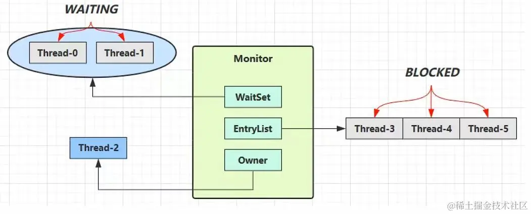 - WaitSet中的Thread-0,Thread-1是之前获得过锁,但条件不满足进入WAITING状态的线程