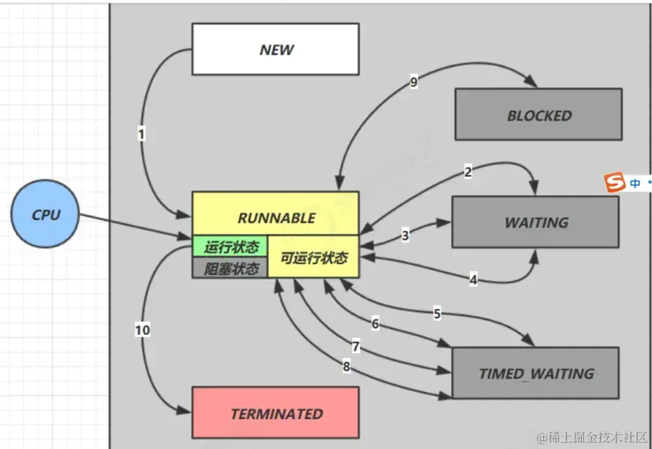 - 【可运行状态】、【运行状态】和【阻塞状态】(由于 BIO 导致的线程阻塞,在 Java 里无法区分,仍然认为 是可运行)