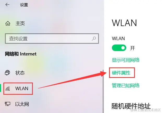 步骤2:在 【WLAN】 右侧窗口点击 【硬件属性】 。