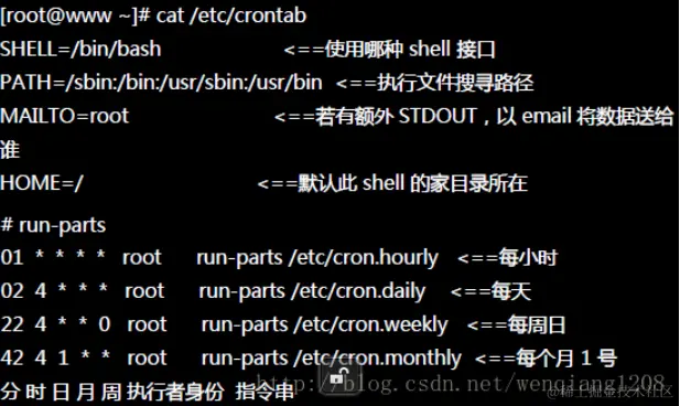 的所有可执行文件』,也就是说,每个小时的01分,系统会以root身份去/etc/cron.hourly这个目录下执行所有可执行的文件!后面三行也是类似的意思!你可以到 /etc/ 底下去看看,系统本来就预设了这4个目录!你可以将每天需要执行的命令直接写到/etc/cron.daily即可,还不需要使用到crontab -e的程式!