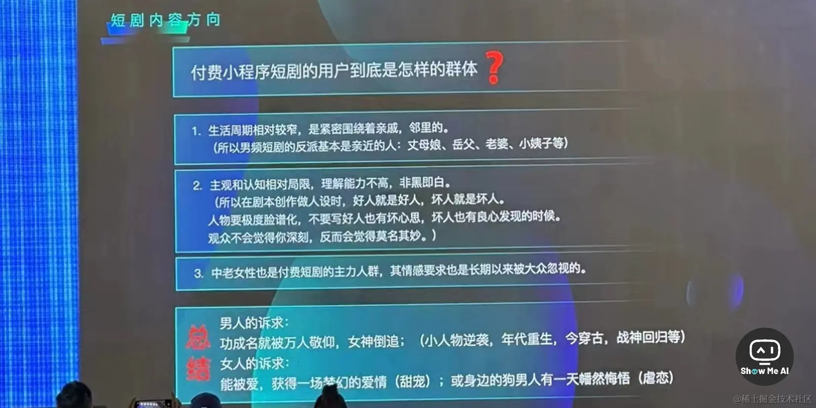 前两天,杭州举办了《首届短剧高峰论坛》,嘉宾名单里可以看到很多我们熟知的短剧平台和制作公司。👆 这是现场关于「短剧内容方向」的业内洞察,跟上面数据统计的结果基本一致。整体来说:
