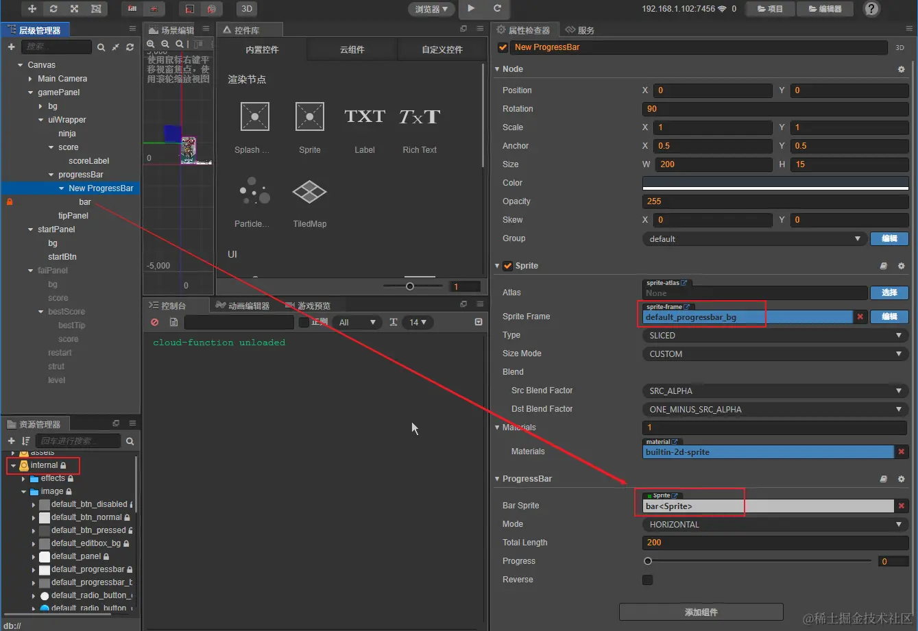 大部分组件的设置可以从文档里看到,如碰撞组件 BoxCollider,渲染组件里 Sprite(精灵组件设置图片等参数),但是如何要用到其自带滑块,并也用他的精灵图,位置在 internal 里(当时我找了老半天)。