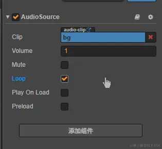 在 Main Camera 下添加一个空白节点,在该节点中添加 AudioSource 组件,Clip 就是从 assets 里拖入的 mp3 文件。