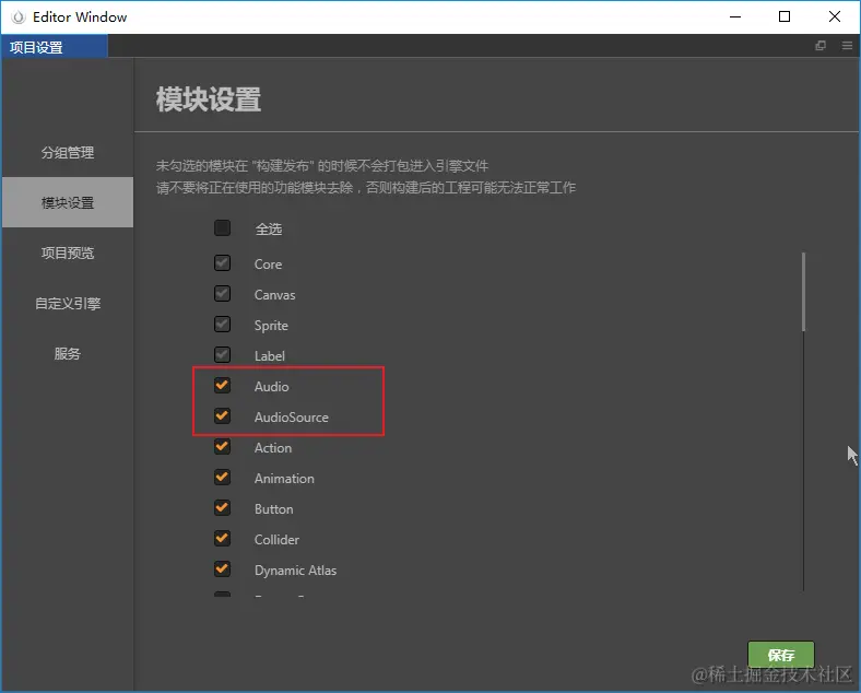 一开始我以为是引擎版本原因,切换几次后发现根本不是,因为把代码放到相同版本下的其他项目下是正常的。最主要的是打包后报的错误真不好排查,导致在这个问题上花了很多时间。最后在比较打包后的 js 文件,才怀疑是不是有些引擎里的模块没搭建来,顺着这个思路果真是音乐音效的模块被我关了,前面我还一直以为是 this 指向那里的代码有问题。