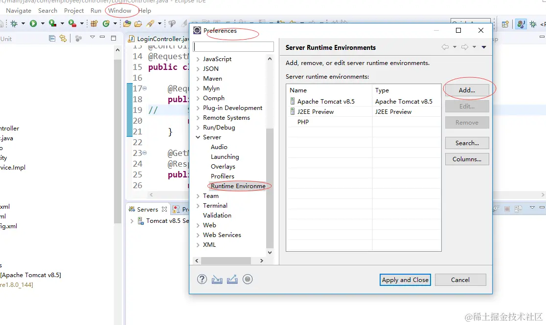 2.打开Eclipse,单击“window”菜单,选择下方的“Preferences” 。