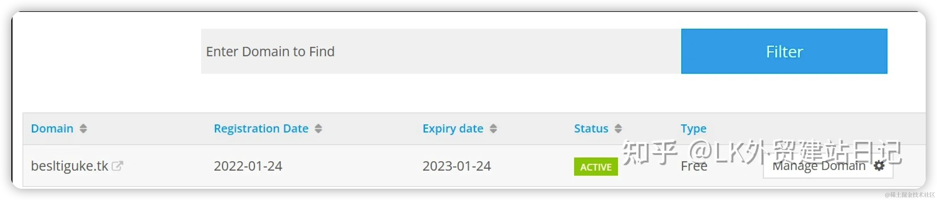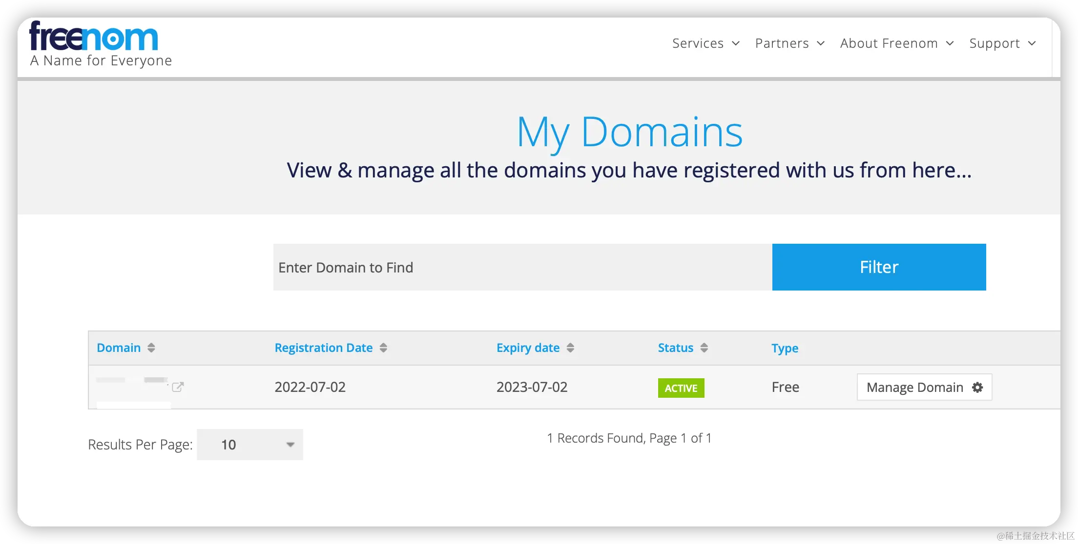 Services->My Domains】,打开申请的域名列表界面,即可看到自己申请的所有域名