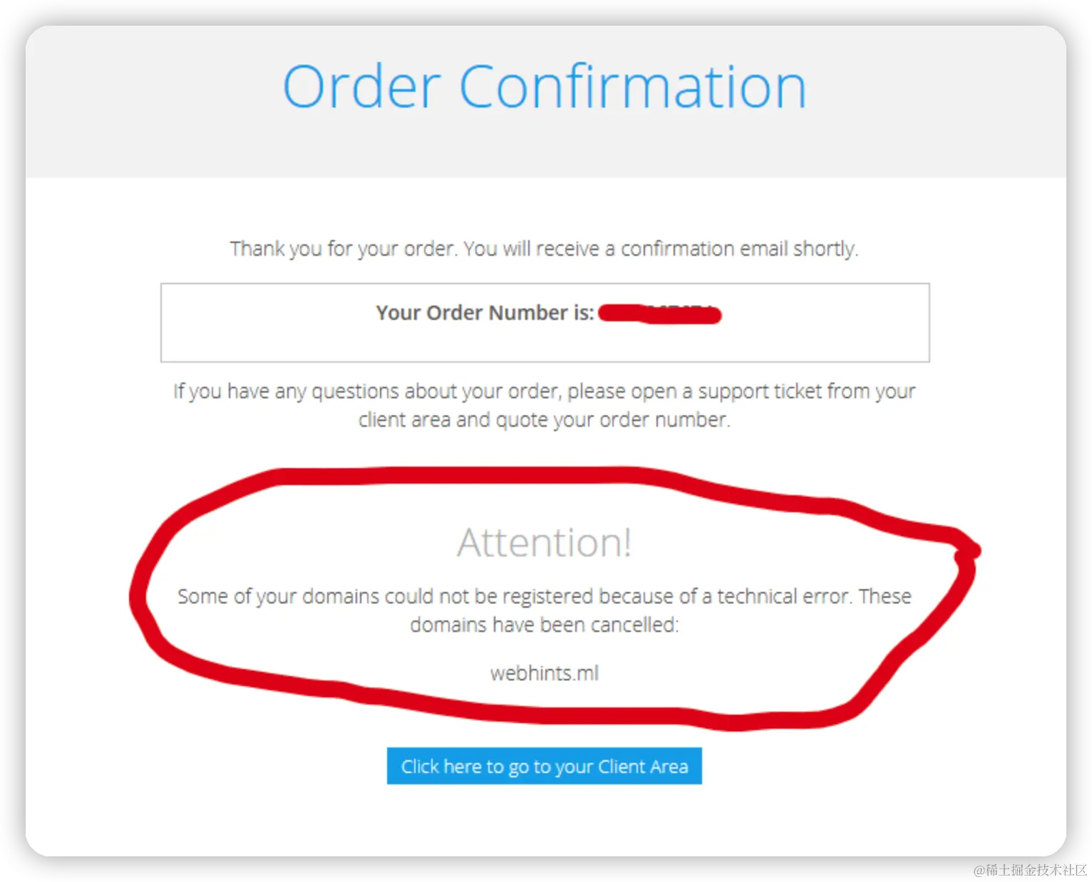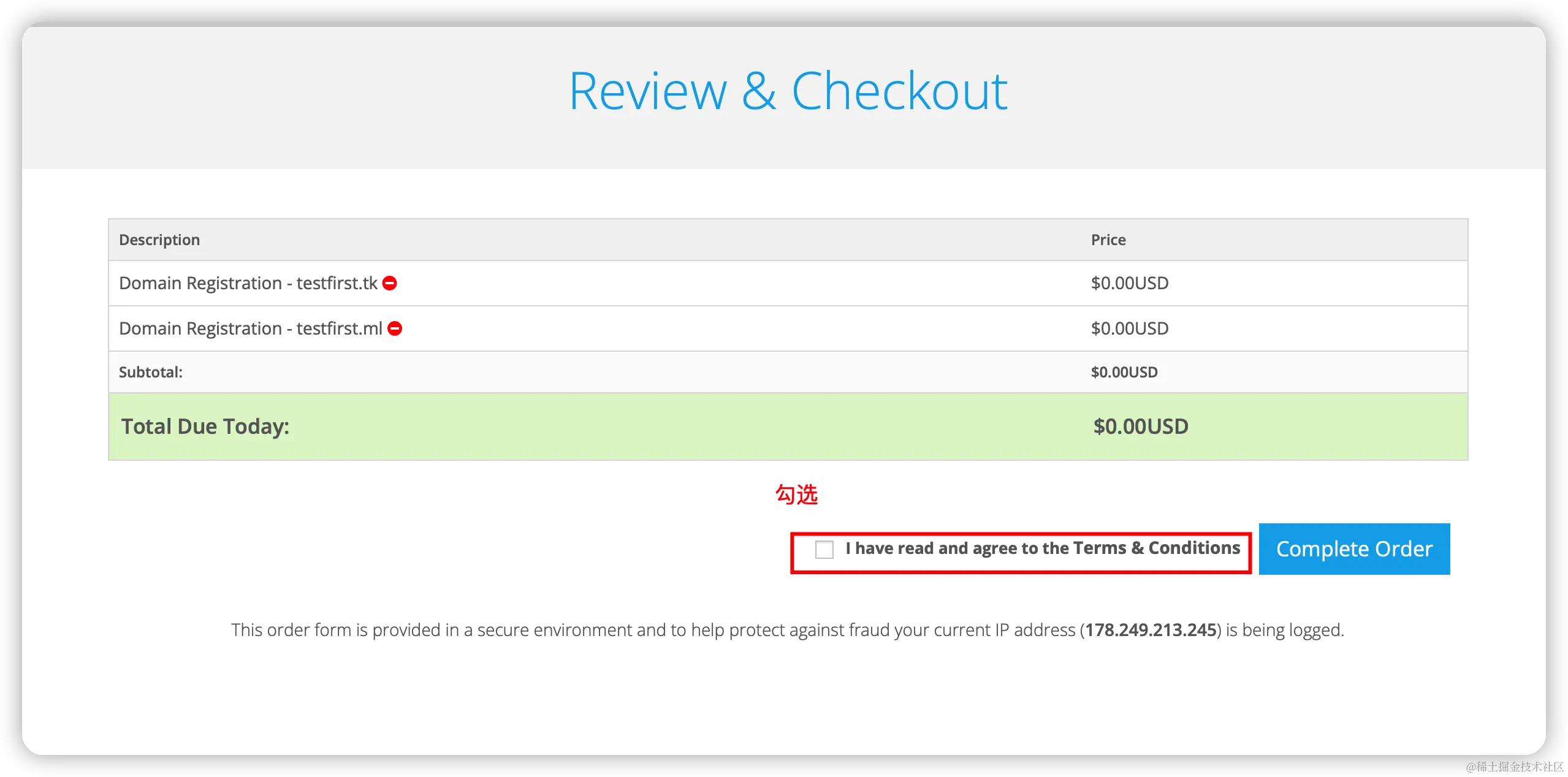 I have read and agree to the Terms & Conditions之后点击Complete Order按钮,即可完成域名的申请;【注意:如果遇到申请域名失败,参考注册&申请域名中的第5步】