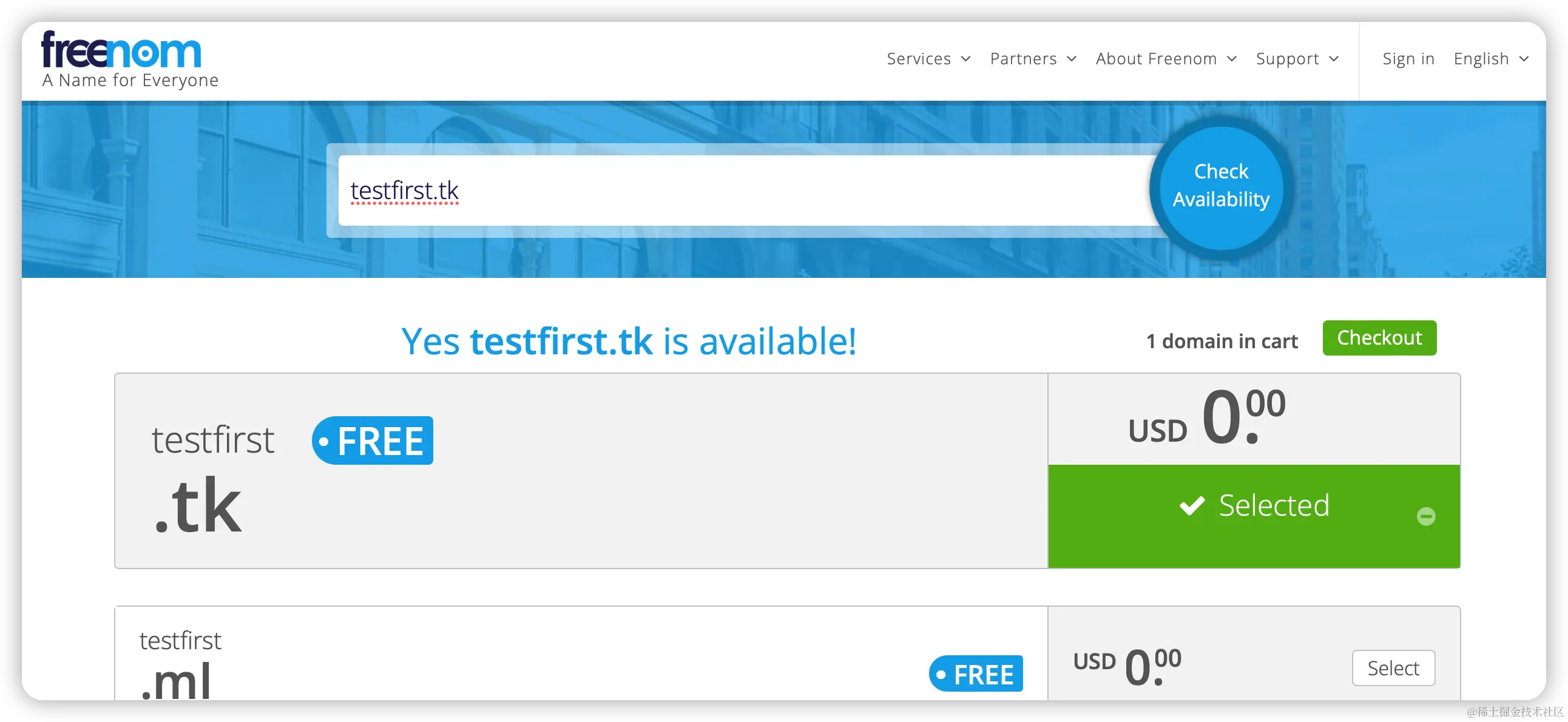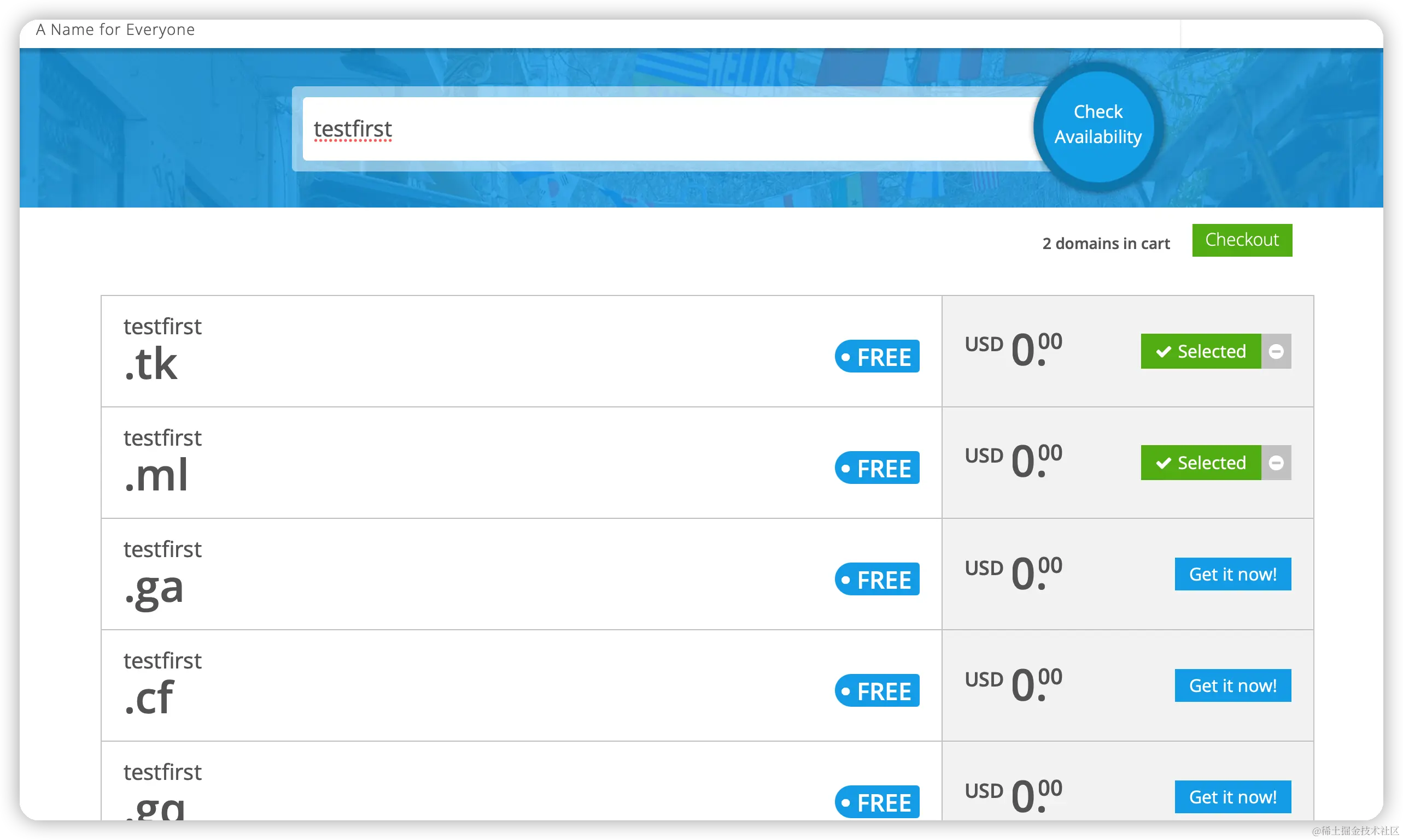 免费域名以及付费域名,点击Get it now!校验免费域名是否可以使用,如果可以使用就会加入到购物车中;否者就会显示Not available