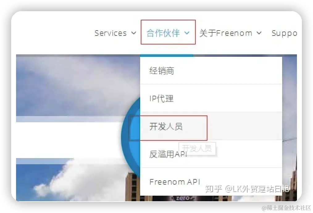 在首页的“合作伙伴”,“开发人员”