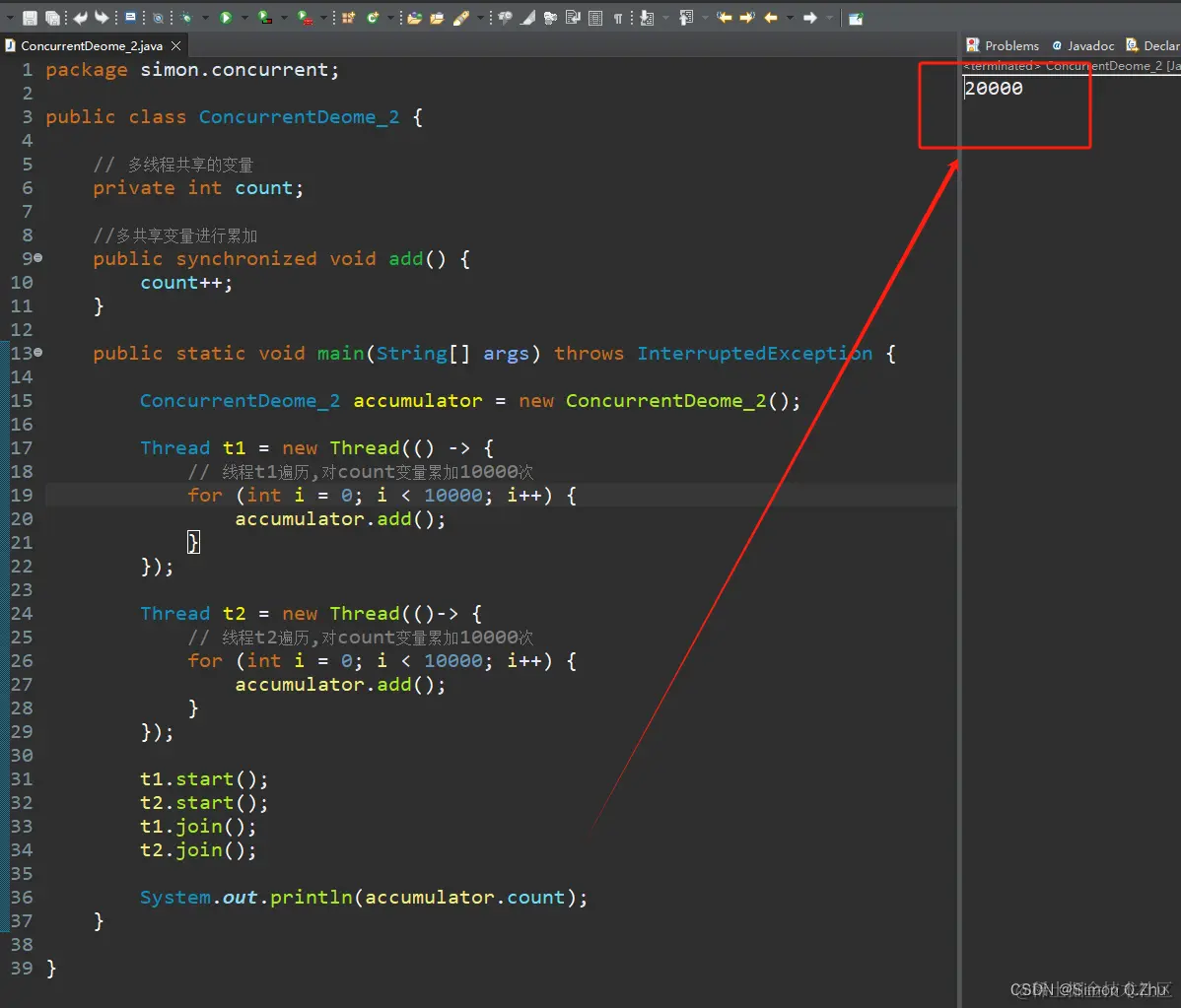 如果不去考虑并发编程的原子性和可见性导致的线程安全的问题,经过2个线程各10000次累加,最后的结果必然是20000,可是实际的输出结果往往到不了20000。 这就是多线程下同时去操作共享资源而导致的数据不一致性。设想下这个count如果代表的是商品的库存,多线程代表商家补货操作,这势必会造成严重的错误。那么synchronized的出现就有效了解决了此为数据不一致的问题。我们只需在add()方法前加一个synchronized修饰,如下图: