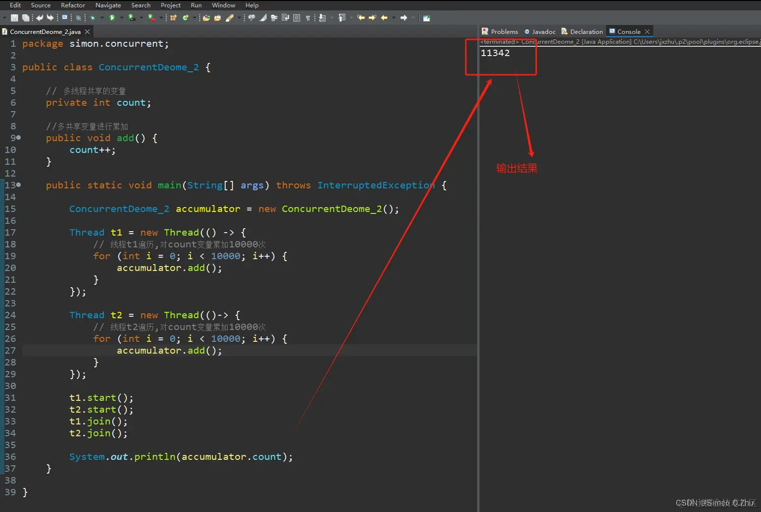 下面用代码举个例子。在一个类中定义一个int变量和一个对该变量进行累加的方法,并实例化出一个类的对象,然后起两个线程分别在线程中对同一个对象执行10000次累加操作,最后输出对象中count的值。