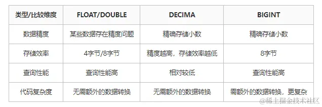 下面我们再汇总上面的内容,展示这几种类型在数据精度,存储效率,查询性能,代码复杂性等几个维度上的差异: