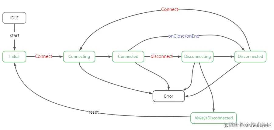 两者差别在于,如果是主动断开会经历Disconnecting状态,而被动断开则不会经过此状态,因此我们就可以在on("close")事件中处理将状态转换至AlwaysDisconnected或DISCONNECTED。
