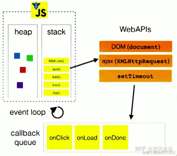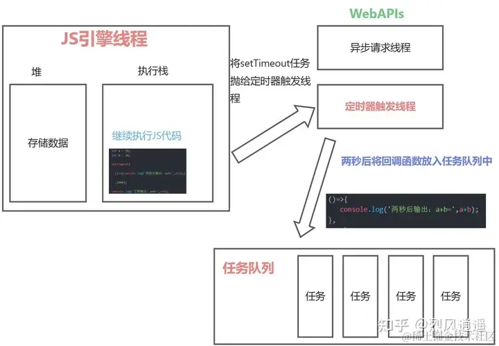 除了网络请求之外,还有定时器系列,像setTimeout,setIntervel之类,JS引擎线程会将这些任务分配给浏览器中定时触发线程。事件监听任务,JS引擎线程会将其分配给浏览器中事件处理线程处理。这样就实现了异步的效果。