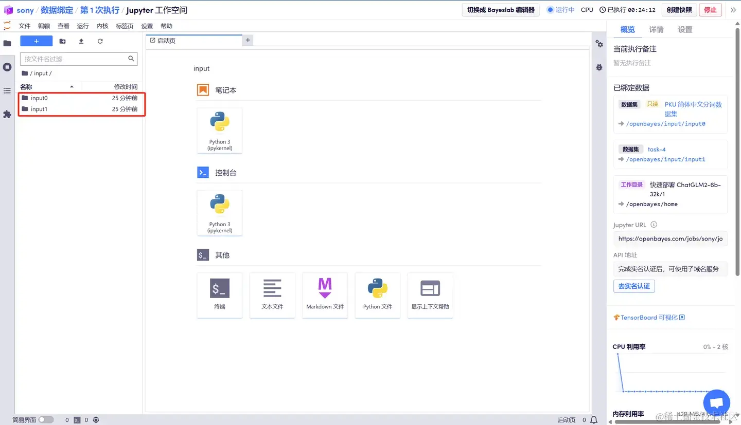 点击 input 目录就可以看到我们刚绑定的两个额外的数据 input0 和 input1。input0 绑定的是个人的数据集,input1 绑定的另外一个公共数据集。