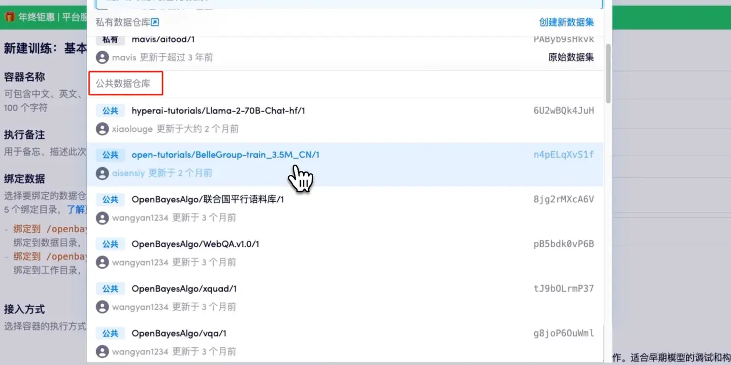 数据绑定的内容可以是私有的数据仓库、公共的数据仓库或历史执行的工作目录。点击右侧的搜索框,可以看到罗列出来的数据类型。