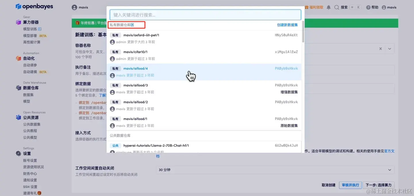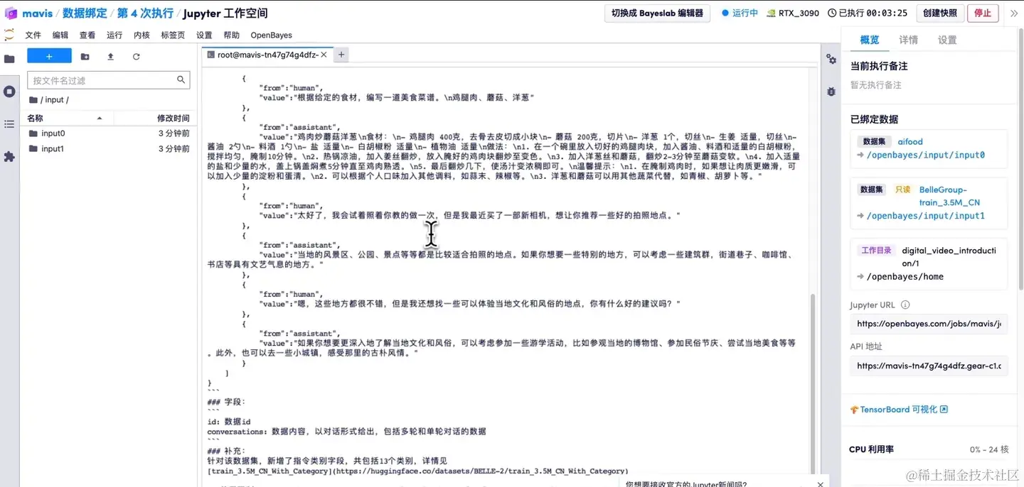 其中 input0 绑定的就是我自己的一个数据集,叫做 aifood,input1 绑定的是一个公共数据集。