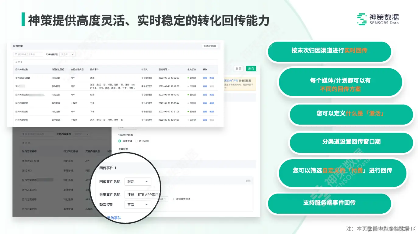 高度灵活的回传策略是广告优化的前提条件。神策广告分析支持企业自定义回传方案,通过调整各媒体的回传策略,优化广告模型,实现用户注册量的显著提升。