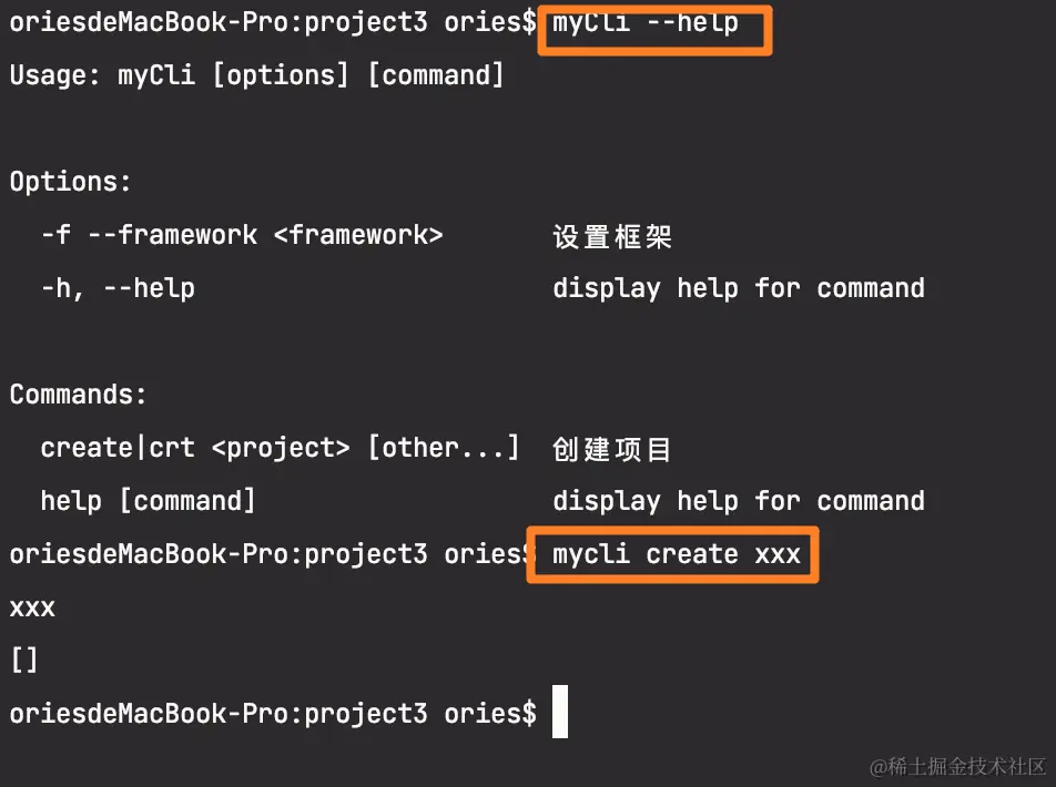 在lib/core/myCommander.js中,我们定义了create命令,它接受一个项目名和其他参数。我们使用action函数来处理这个命令。