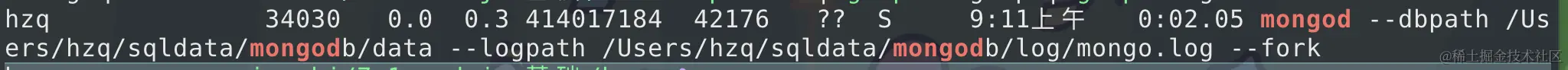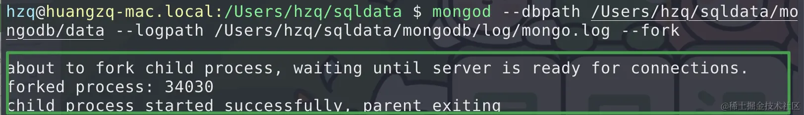 mongod --dbpath /Users/hzq/sqldata/mongodb/data --logpath /Users/hzq/sqldata/mongodb/log/mongo.log