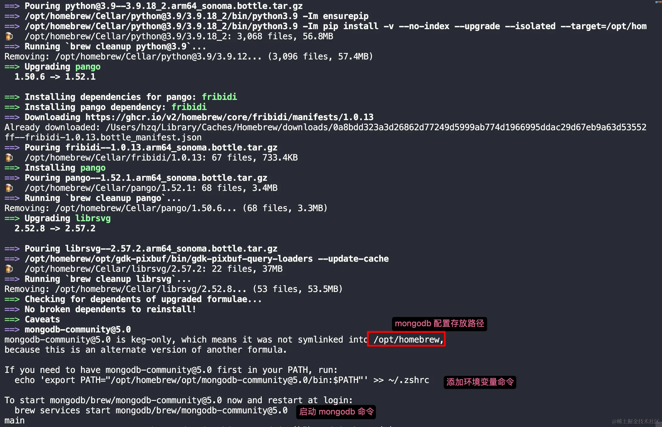 运行echo 'export PATH="/opt/homebrew/opt/mongodb-community@5.0/bin:$PATH"' >> ~/.zshrc将其注入环境变量,然后再source ~/.zshrc一下,就可以使用mongo、mongod命令了