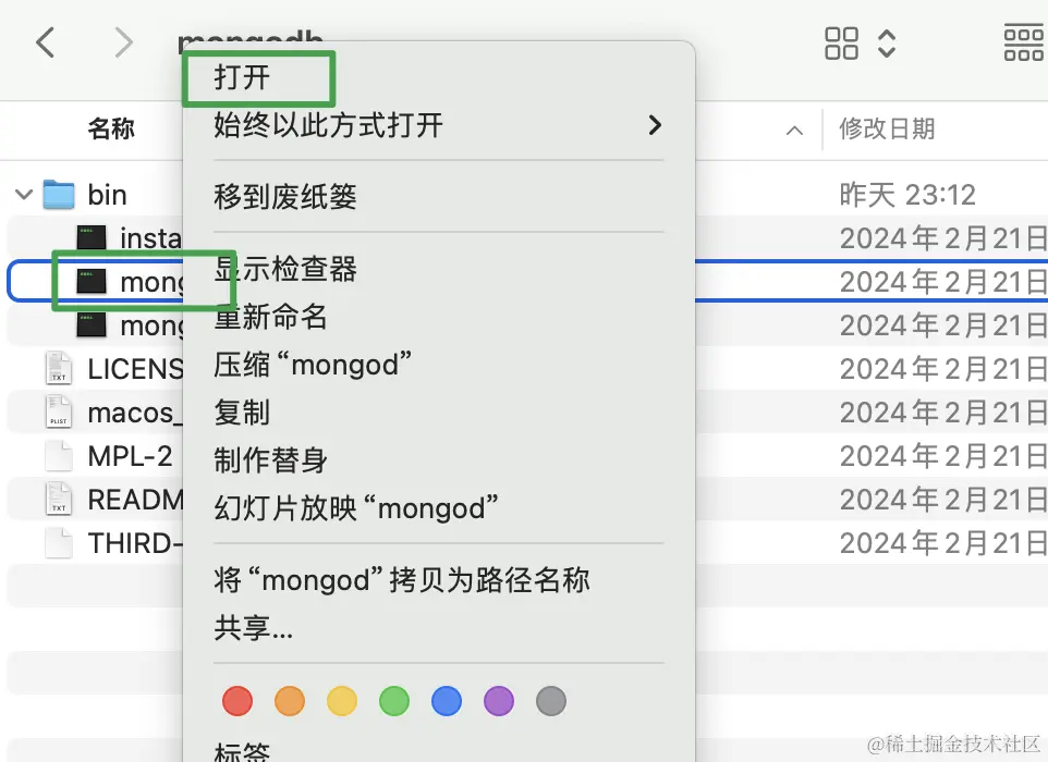 8、若出现异常情况,比如提示xxx不安全,则“访达”进入/usr/local/mongodb/bin文件夹,找到mongod,然后右键 -> 打开,之后一路都点ok