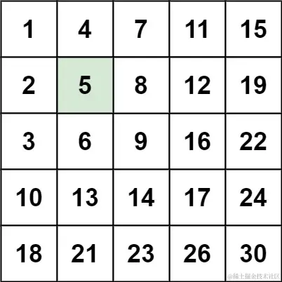 输入:matrix = [[1,4,7,11,15],[2,5,8,12,19],[3,6,9,16,22],[10,13,14,17,24],[18,21,23,26,30]], target = 5