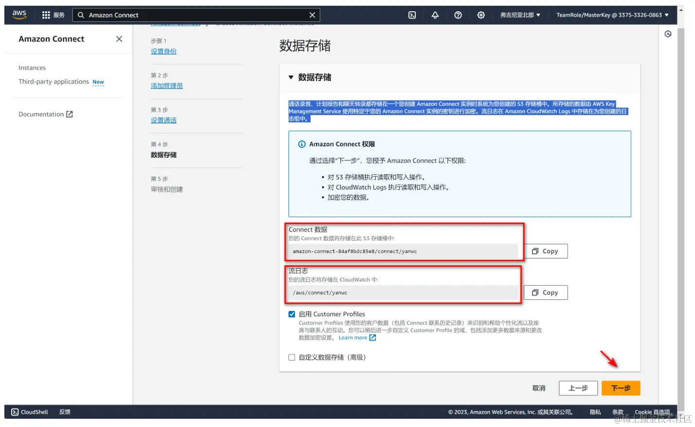 通话录音、计划报告和聊天转录都存储在一个您创建 Amazon Connect 实例时系统为您创建的 S3 存储桶中。使用特定于您的 Amazon Connect 实例的密钥进行加密。流日志在 Amazon CloudWatch Logs 中存储在为您创建的日志组中。