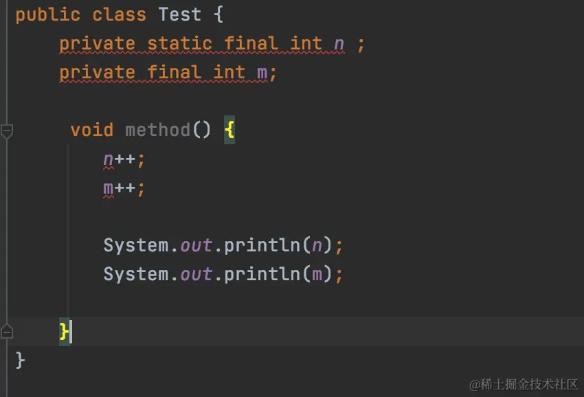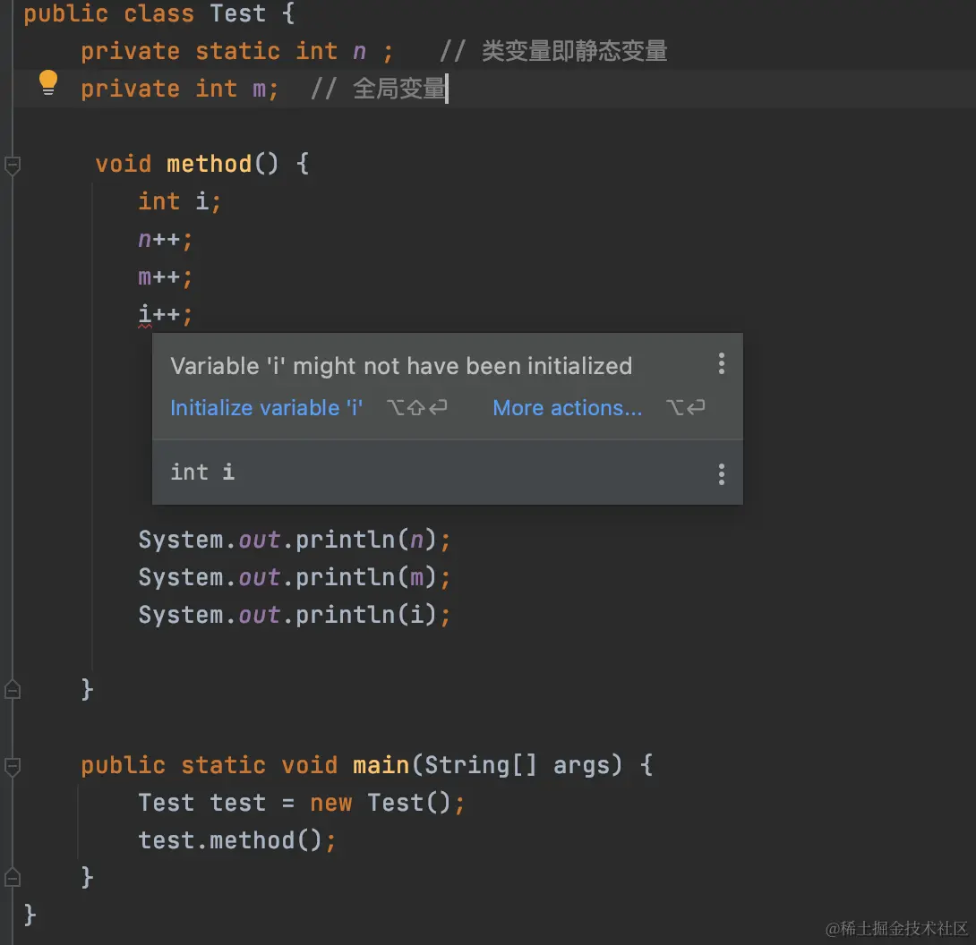 i没有赋值就使用代码爆红编译通不过,而类变量n和全局变量m都没有赋值,但是可以在直接使用,上面代码去掉局部变量i编译通过之后,控制会打印两行1,因为对n,m进行了++操作。 -