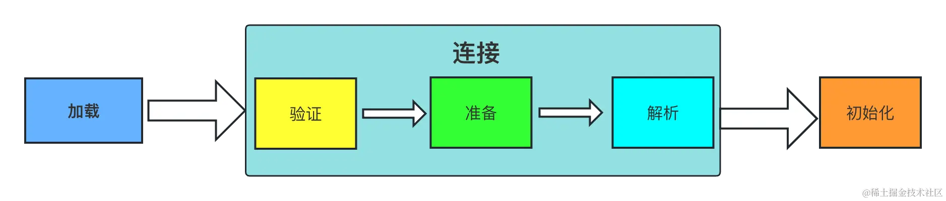 根据上面的概述可知,JVM加载 Class 类型的文件主要三步:加载->连接->初始化。连接过程又可分为三步:验证->准备->解析。过程如下图所示: