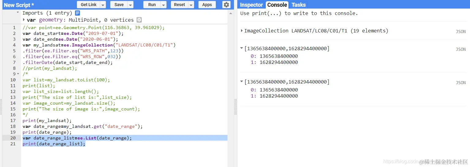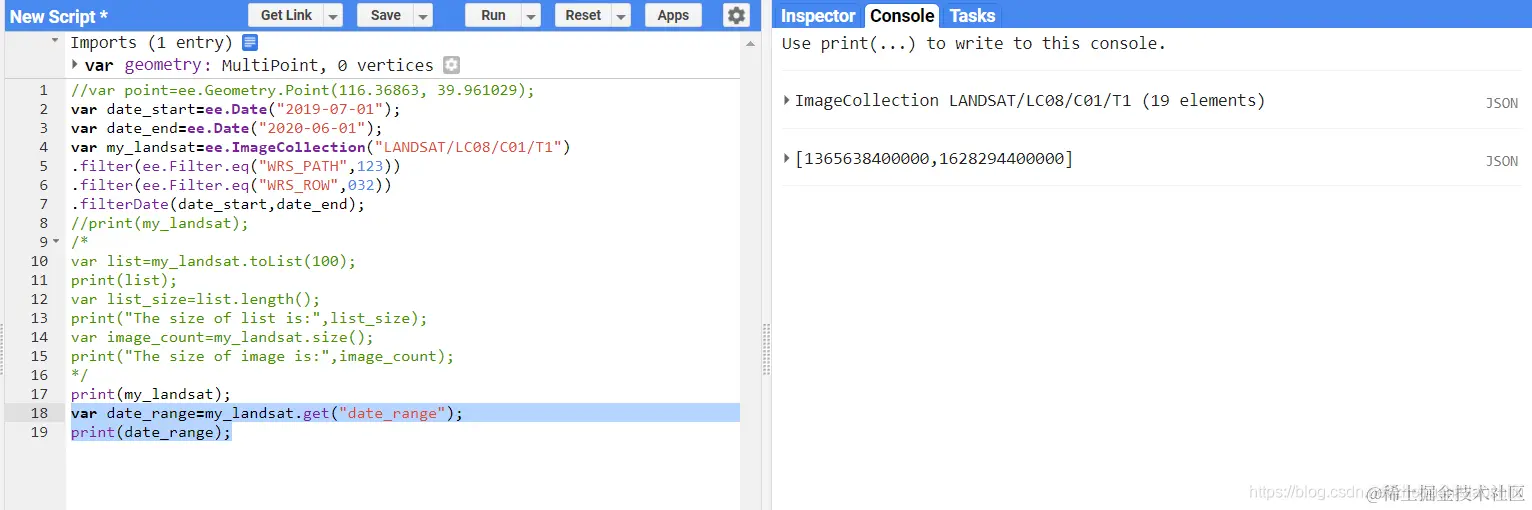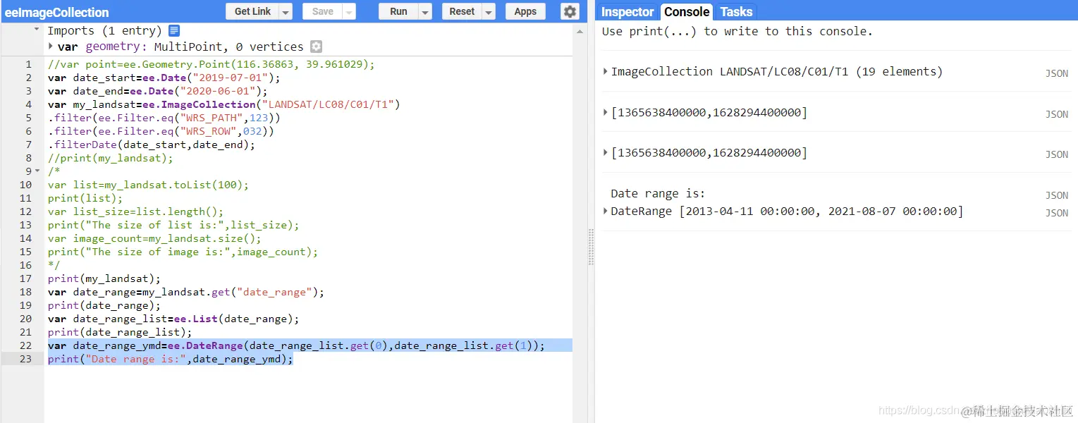 其中,ee.DateRange()就是一个可以起到转换时间格式作用的函数;同时,分别用.get()函数获取起止时间的第一个和第二个元素;# 谷歌地球引擎GEE的JavaScript代码基础知识与用法已经介绍过,列表元素初始下标为0,因此分别用0和1来获取列表中的第一个和第二个元素。