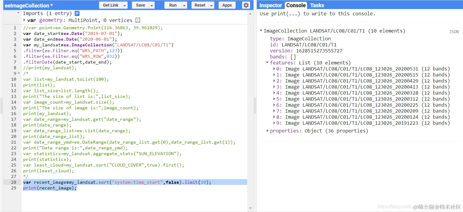 其中,利用.limit()函数获取有限的遥感影像,10表示获取10景,即获取成像时间离目前最近的10景遥感影像。因此,执行这一代码后获取的是多景遥感影像,即ee.ImageCollection格式的数据。