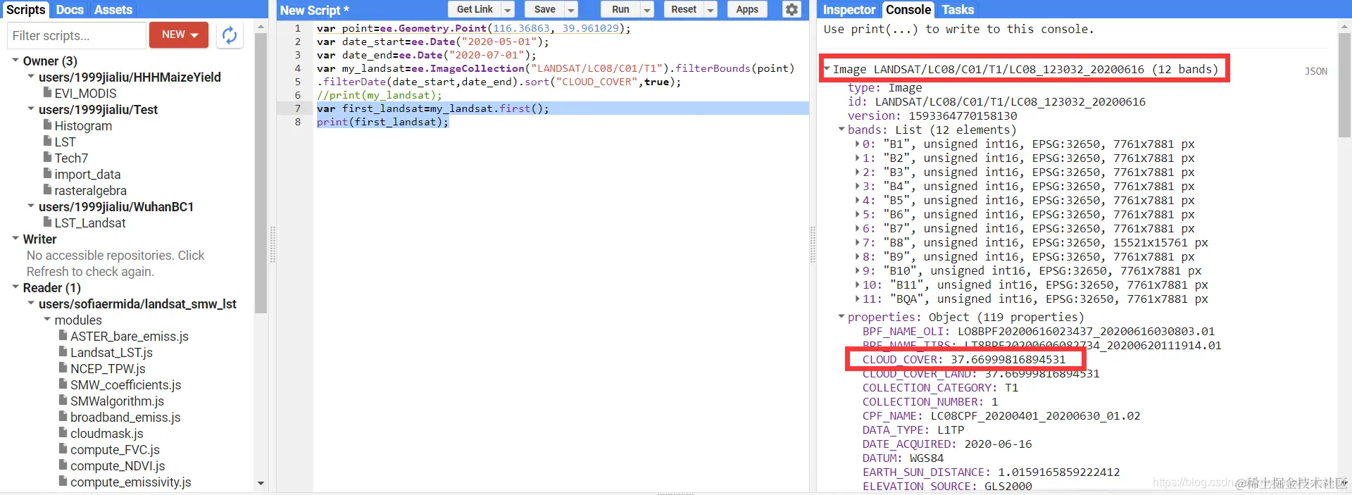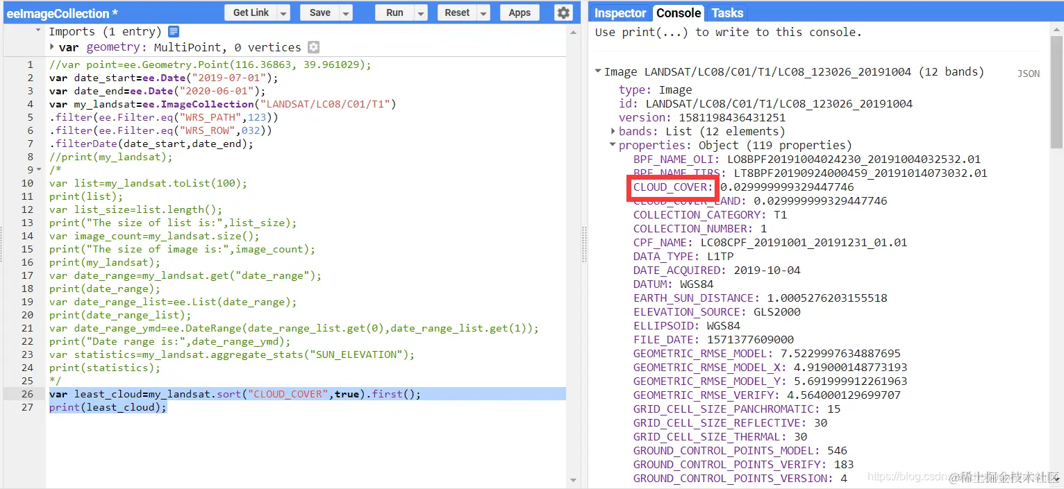 在这里,"CLOUD_COVER"表示遥感影像的云覆盖量,true表示按照排序指标的升序进行排列——即对于ee.ImageCollection格式数据中多景遥感影像,基于云覆盖量由少至多的顺序进行排列。还有需要强调的一点是,"CLOUD_COVER"并不是遥感影像波段的名称,而属于影像的元数据,或者说是属性。