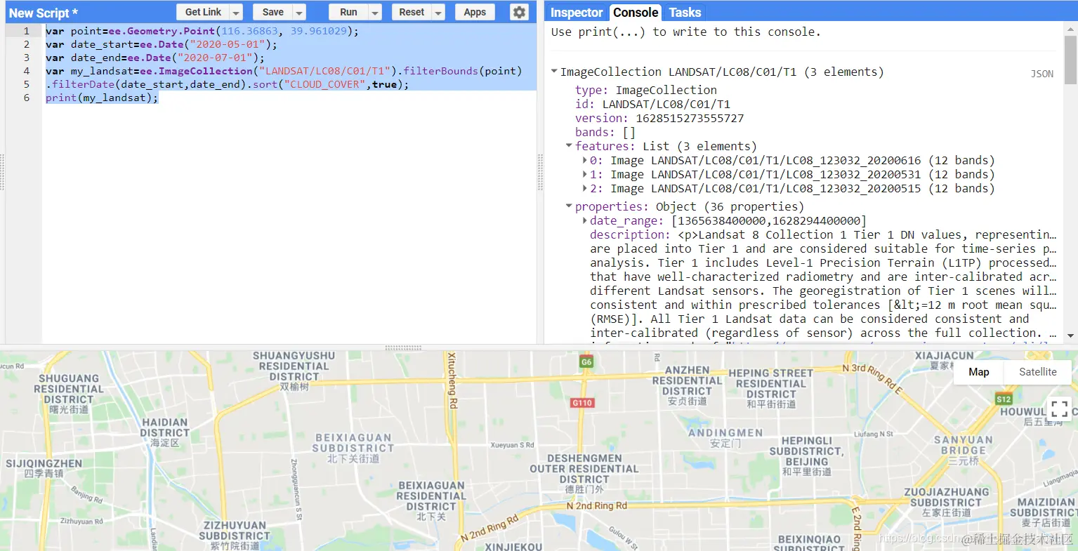 通过print()函数打印在右侧的信息,我们可以看到这个ee.ImageCollection格式数据中包含三个元素(即3 elements),也就是含有三景重叠的遥感影像。