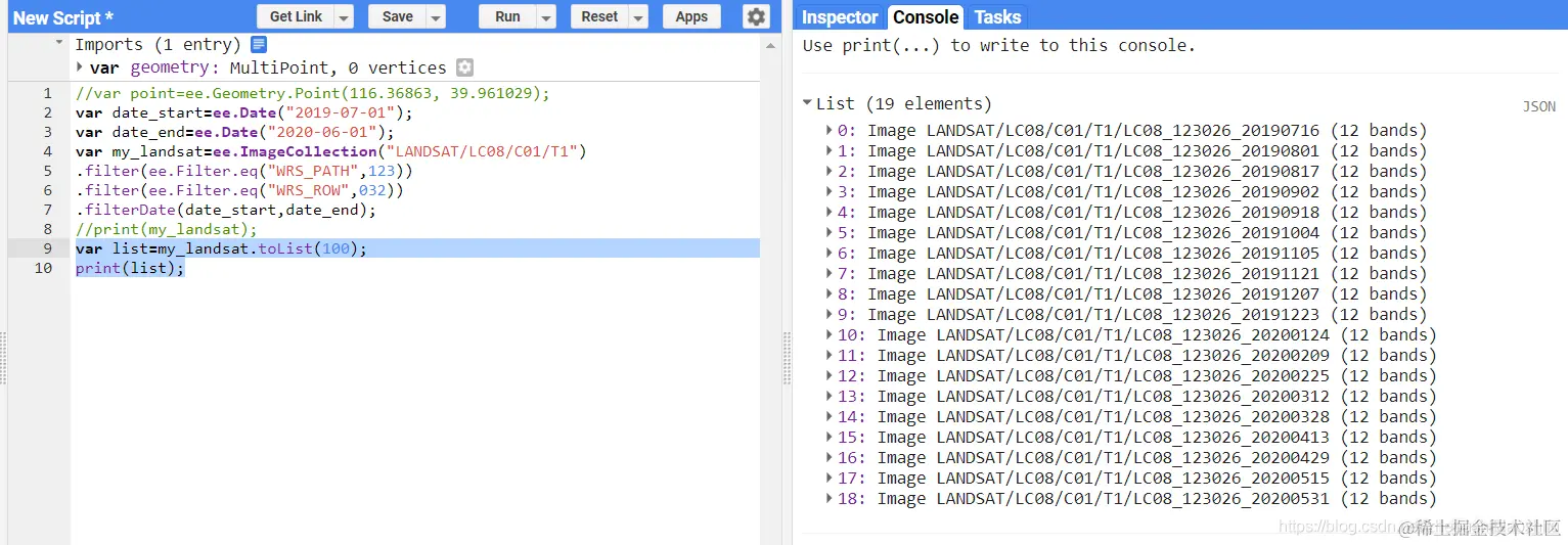 其中,.toList()函数作用是将原有数据(ee.ImageCollection格式数据中每一个要素的名称)转为列表,100表示从ee.ImageCollection格式数据中获取要素名称的最大个数(即最多从ee.ImageCollection格式数据中获取100个要素的名称存入列表),这一参数只要远大于ee.ImageCollection格式数据中的要素个数即可。