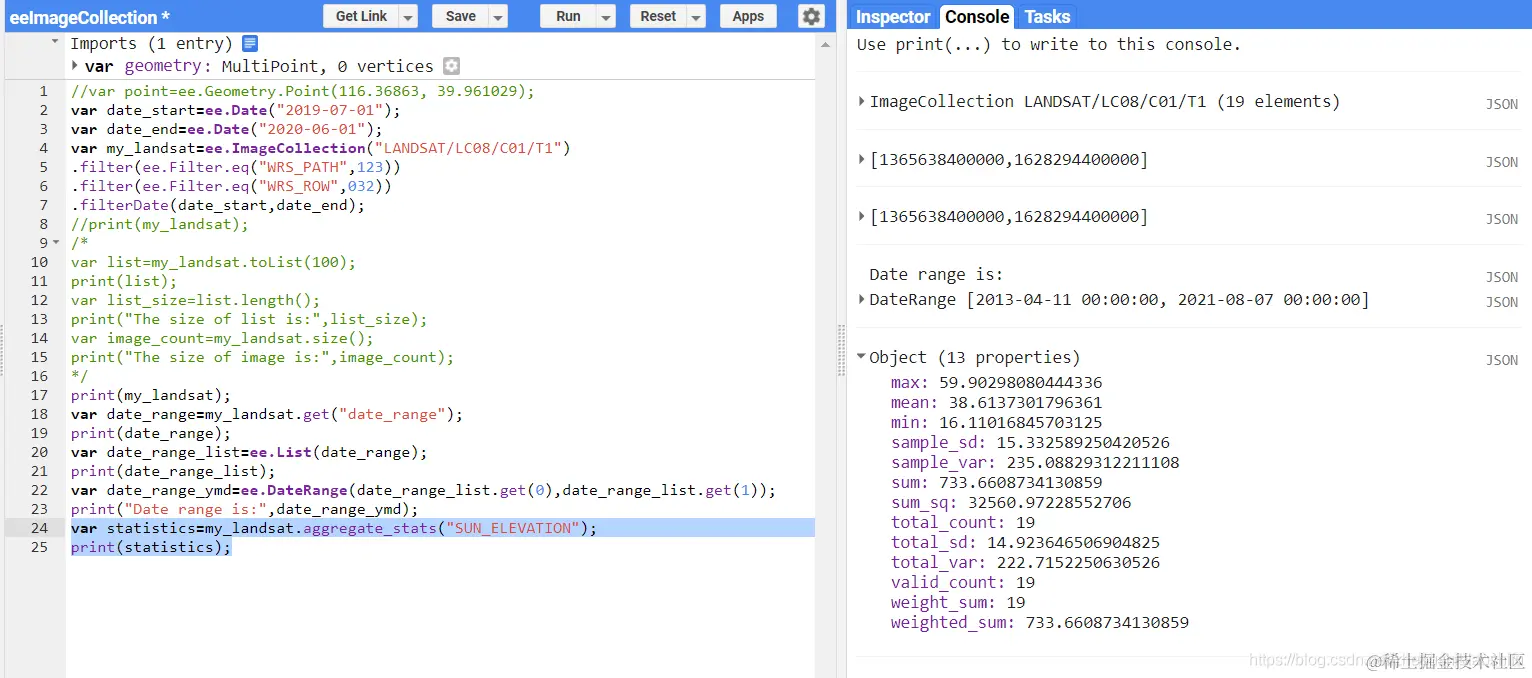 还可以利用.aggregate_stats()函数统计ee.ImageCollection格式数据某一项属性的信息,其统计得到的信息包括ee.ImageCollection格式数据中,全部遥感影像的某一项属性值的极值、总和、平均值、标准差等。